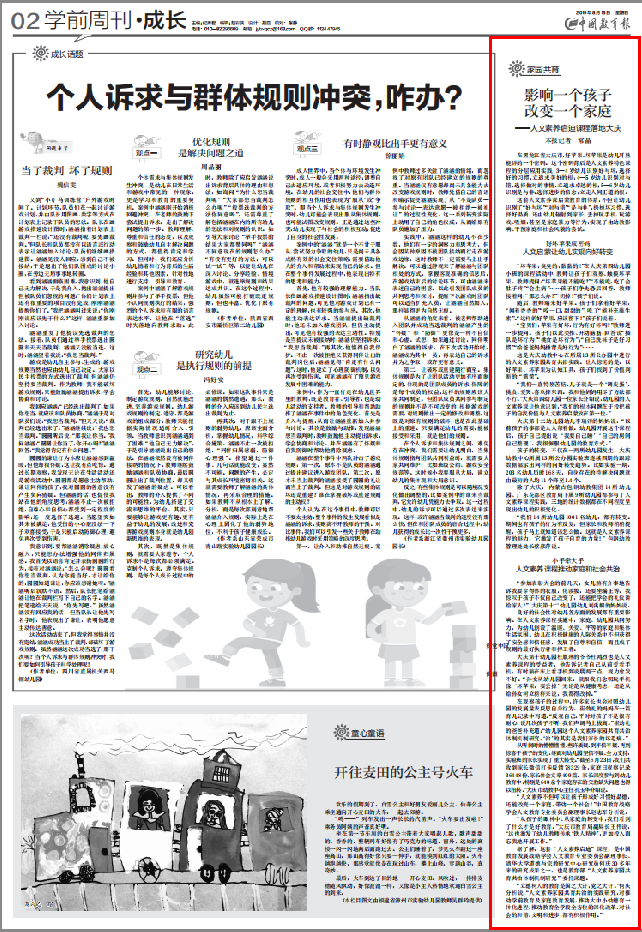 中国教育报《影响一个孩子 改变一个家庭》在黑龙江省大庆市,好苹果、坏苹果是幼儿耳熟能详的一个密码。这个密码背后是人文素养特色课程的分层应用实践:3—4岁幼儿识别好与坏,选择好的习惯,立追求美好的根;4—5岁幼儿识别对与错,选择做对的事情,立追求卓越的根;5—6岁幼儿识别是与非,选择进步的信念,立走人间正道的根。查看详情2019-09-03 -