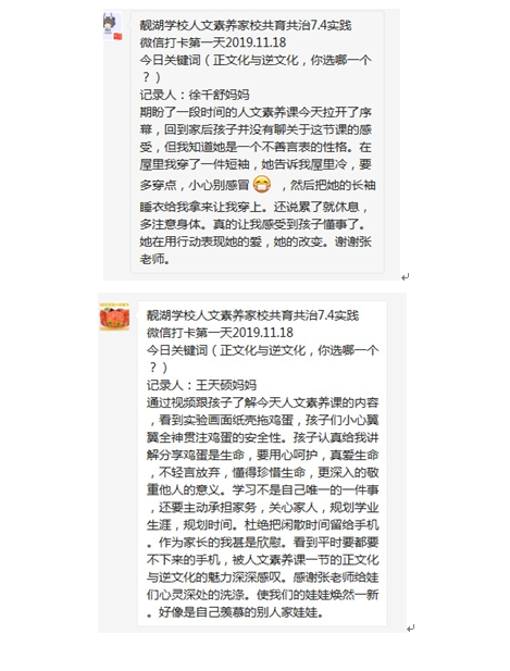 人文教育的生命力在于知行合一,近千条的家校联动好评表明课堂所学已成功走进学生内心,学生能够懂得弃恶扬善、去伪存真、团结友爱、遇事负责、积极进取的优良品质。而这些正是人生的各个时段实现各种愿望的前提条件之一,也是社会成员在社会生活中发挥规范性作用的教化存在。
