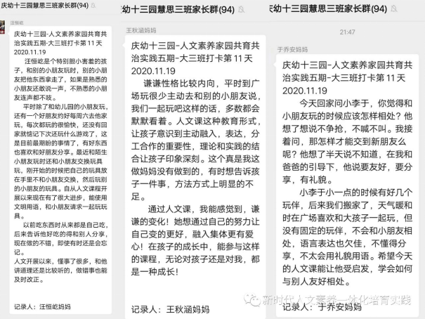 看着孩子身上的转变和家长的反馈,也让我再次对人文素养启迪课程的教育意义和教育功能有了更加深刻的认识。通过老师每天不间断的带动和引领,让家长都积极地参与到了幼儿人文素养培育中来,成为了人文素养启迪课程的受益者和课程的共同责任者。