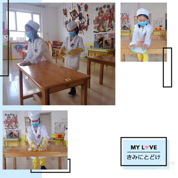 别看我们年龄小,我们劳动起来很认真,老师们每天的消毒步骤,我们可是牢牢记住了呢:“清水擦拭️含氯消毒水擦拭️再清水擦拭”,我们很棒吧!这样擦过的桌子,小朋友用餐时就不怕细菌和病毒进入到食物中了。