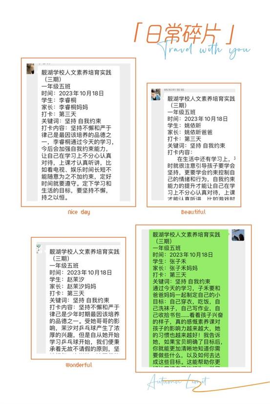 “日日行不怕千万里,时时做不惧千万事。”在平淡琐碎的日子里,在不断坚持和自我约束中,生活不知不觉就变了模样。成功,就是由无数个努力的瞬间积累起来的。靓湖学校人文素养课的价值,不止步于课堂,而是在潜移默化中改变孩子的一生。