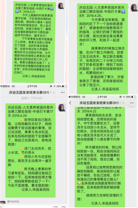 在活动开展过程中,一次,果果因为想得到奖励而撒了慌,谎称自己没有剩饭!莉莉老师及时将信息反馈给我,我和果果进行了深刻的谈话。最后孩子积极改正了,我有时会想这个问题如果没有及时的和孩子沟通改正,后果非常严重。感谢老师的及时发现,认真观察到孩子的每一个细节!我也非常庆幸自己是人文素养培养实验班的家长,能有这么好的契机扔掉孩子身上的坏习惯!
