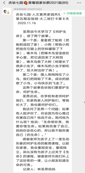 幼儿园是人文素养培育的积极倡导者和实施者,家庭才是人文素养培育的主阵地!幼儿园会在每天的课程结束后,结合课程核心人文元素和具体活动内容,给予家长具体可行的家庭指导建议,带动家庭提升人文家教能力,助力幼儿人文素养培育。快看看孩子们的课后任务卡及家长的真实反馈吧!