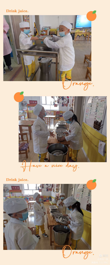 芮芮说:“老师辛苦了,餐盘和饭盆太重了!”