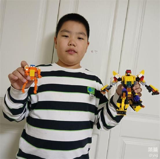 于是,他灵机一动,把散落在玩具箱里的积木零件,挑挑拣拣,自己设计,拼成了两个玩具摆件,还忍不住和我炫耀了一番。